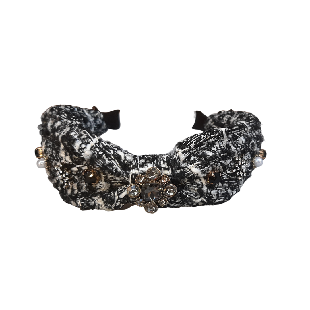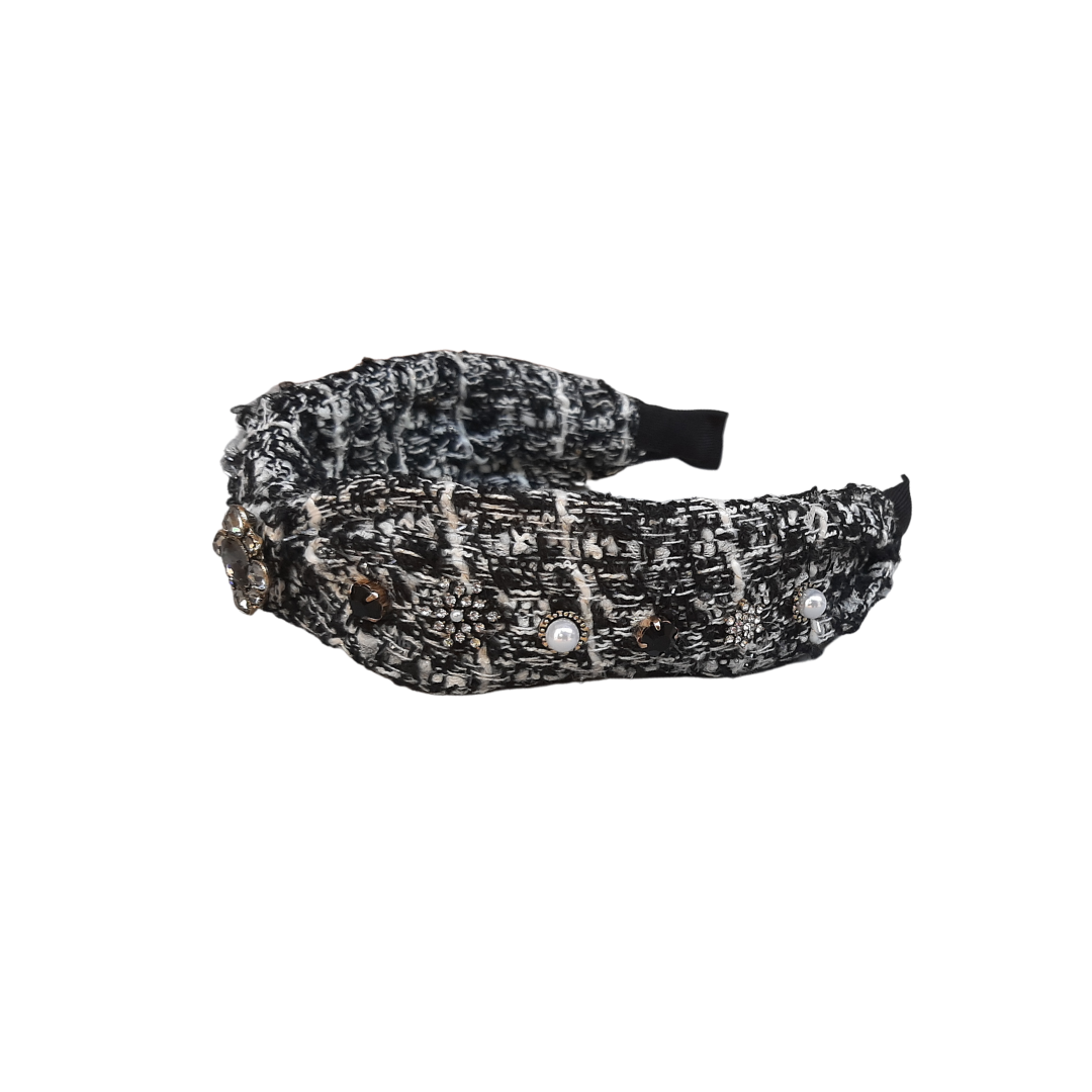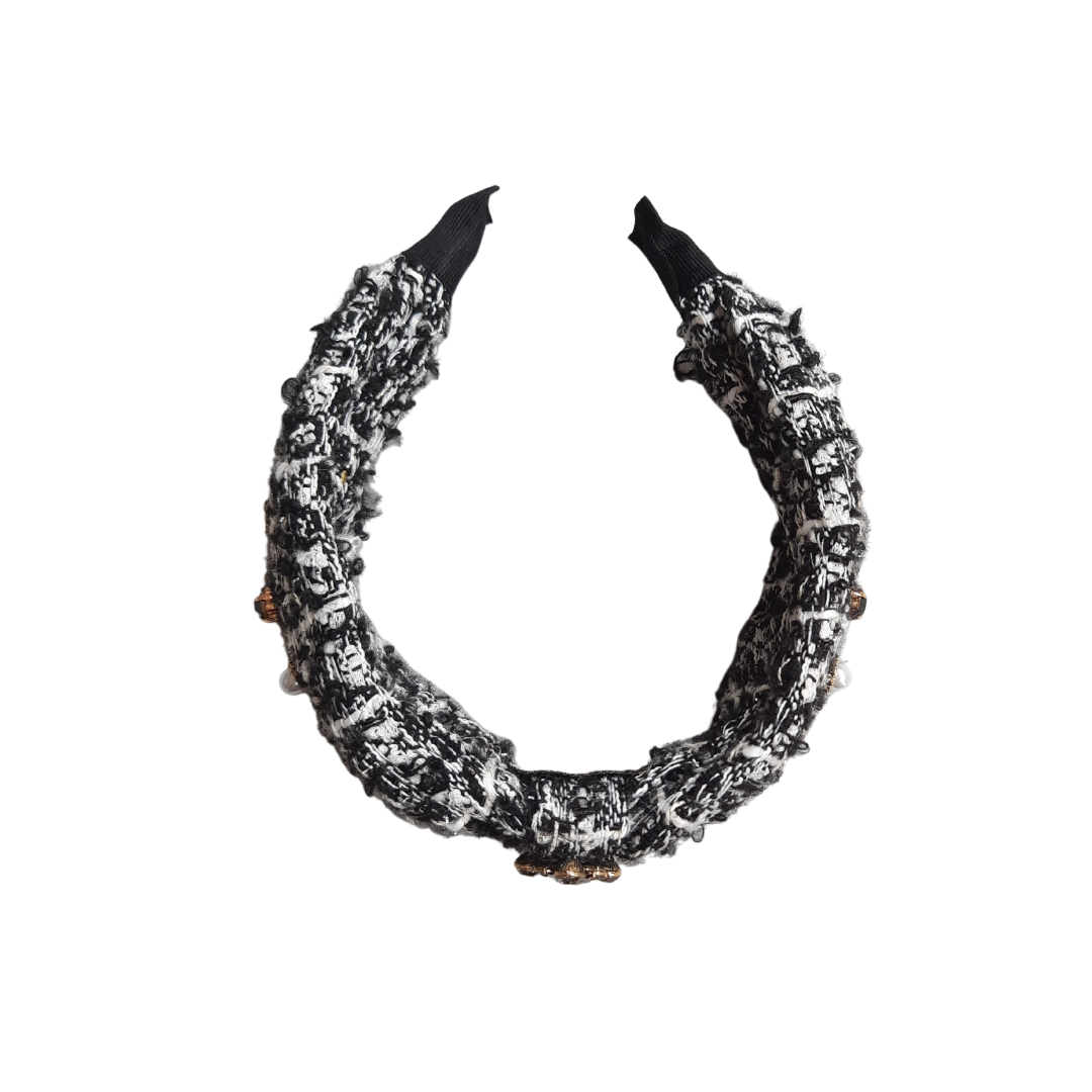 Tiara modelo turbante feita com tweed preto e branco adornada com pedras sintéticas!